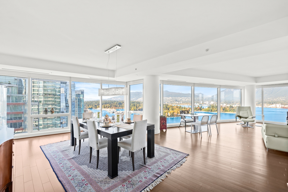 TWO HARBOUR GREEN WATERFRONT ESTATE HOME — A world-class fully furnished residence offering 3,636 sq. ft. of interior living plus nearly 300 sq. ft. of outdoor space. Features include 3 bedrooms, 3.5 bathrooms, an open floor plan, hardwood floors, an entertainer’s kitchen with Miele and Sub-Zero appliances, and a luxurious primary suite with a spa-inspired ensuite. Enjoy breathtaking 180-degree northwest water, mountain, and city views. Hotel-style amenities include 24-hour concierge, pool, spa, sauna, guest suite, virtual golf, and a private 3-car garage with storage. Ideally located near Stanley Park, the Seawall, marina, fine dining, and luxury shopping.