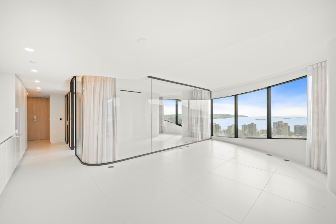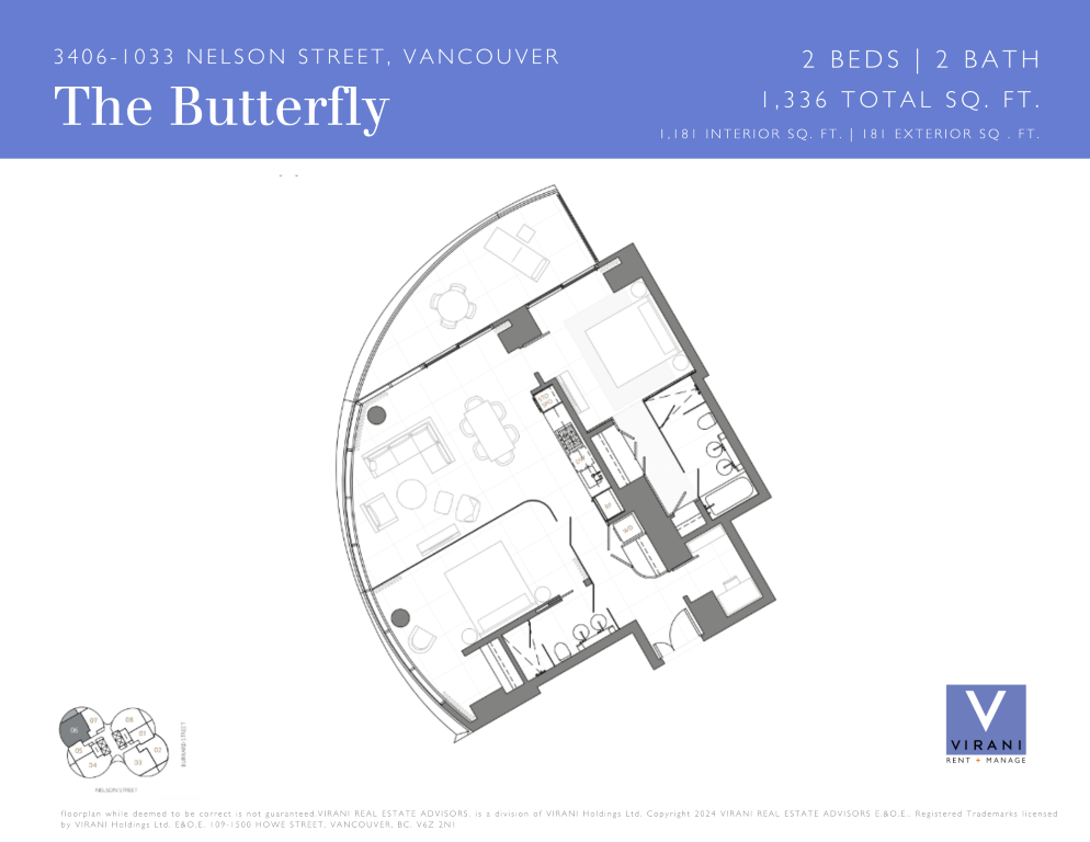 The Butterfly by Westbank, designed by Bing Thom Architects, is a striking new addition to downtown Vancouver’s skyline. This BRAND NEW 2-bedroom, 2-bathroom unit on 34th floor spans 1,336 sq. ft., with 1,181 sq. ft. of interior living and 185 sq. ft. of exterior space. Enjoy breathtaking views of English Bay, mountain and the city. The custom interior includes a eucalyptus veneered front door, large white porcelain flooring, and an Italian-crafted kitchen with Miele appliances. Floor-to-ceiling sheer drapery and curved glass walls enhance the light-filled space. LEED Gold certified, the building excels in energy efficiency and water conservation. Amenities include a 24-hour concierge, sky spa pool, gym, and sauna. 1 Parking Stall, 1 Storage, 1 Bicycle Storage.