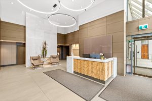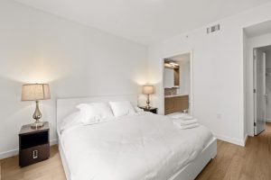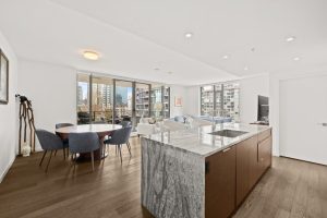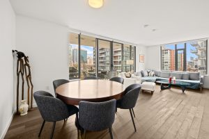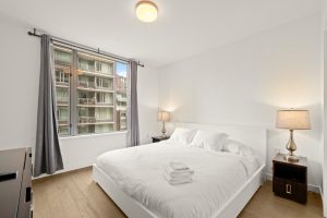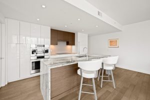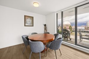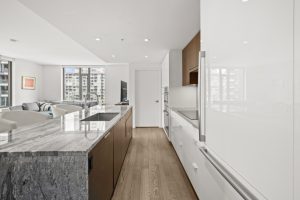 NAVIO offers a prime, furnished 2-bed, 2-bath home with 1,203 sq. ft. of luxurious living space on the seawall in vibrant Southeast False Creek. Enjoy stunning views of a 2.7-acre park, ocean, mountains, and the city skyline from a 149 SF balcony. The open kitchen features wood veneer and high-gloss cabinetry, a granite slab island with waterfall gables, and a full-height pantry. Bathrooms include porcelain tiles, a floating vanity, frameless glass shower door, and in-floor heating. With Bosch appliances, 8'8" ceilings, A/C, and 1 parking stall, NAVIO combines luxury with functionality. Developed by the award-winning Concert.